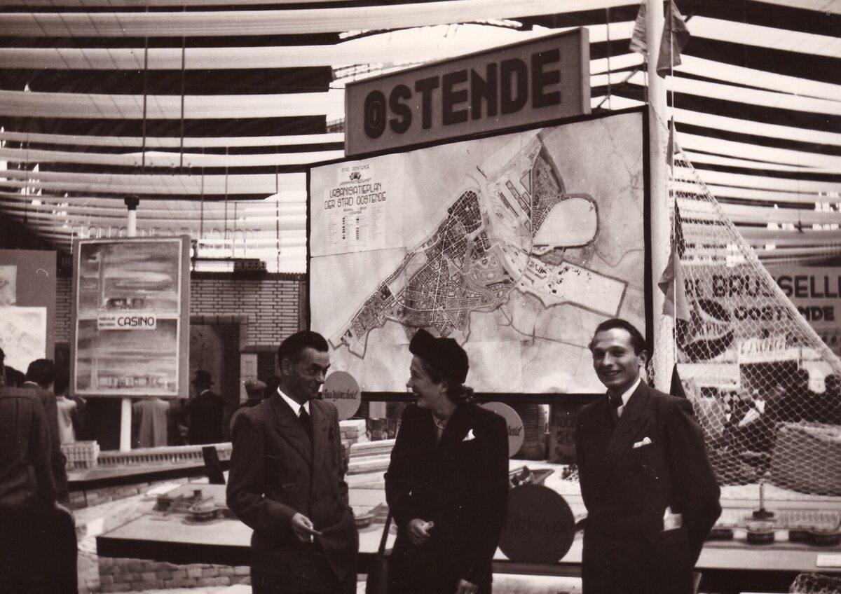 Formaat : 13 x 18 cm. - De stand van Oostende op de handelsbeurs in de Albert hall van het oud station op het Ernest Feysplein. Rechts een jonge Arnold Devos (ingenieur architect, hoofd van de stedelijke dienst Urbanistie), en zijn echtgenote.