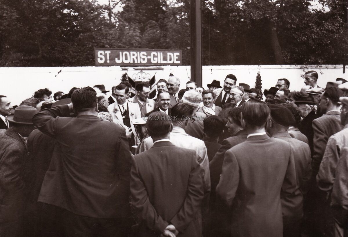 De balboogschutters Sint Jorisgilde in feest. Centraal, burgemeester Adolf Van Glabbeke, met achter hem schepen Maurice Quaghebeur. Hier in hun lokaal Café Armenonville in het Maria-Hendrikpark.