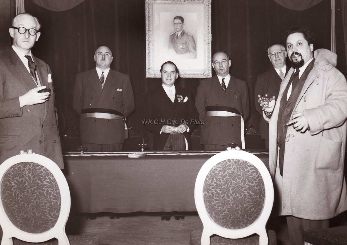 De gekende franse oceanograaf Alain Bombard wordt ontvangen op het Oostends stadhuis (het huidige gerechtshof). Achter de tafel van links naar rechts schepen Maurice Quaghebeur sr., burgemeester Adolf Van Glabbeke, schepen Kamiel Dehouck en stadssecretaris Michel Surmont. Rechts Alain Bombard. Hij gaf ook een lezing in de Koninklijke Schouwburg en werd na zijn ontvangst op het stadhuis ook begroet in de Rotary Club.
