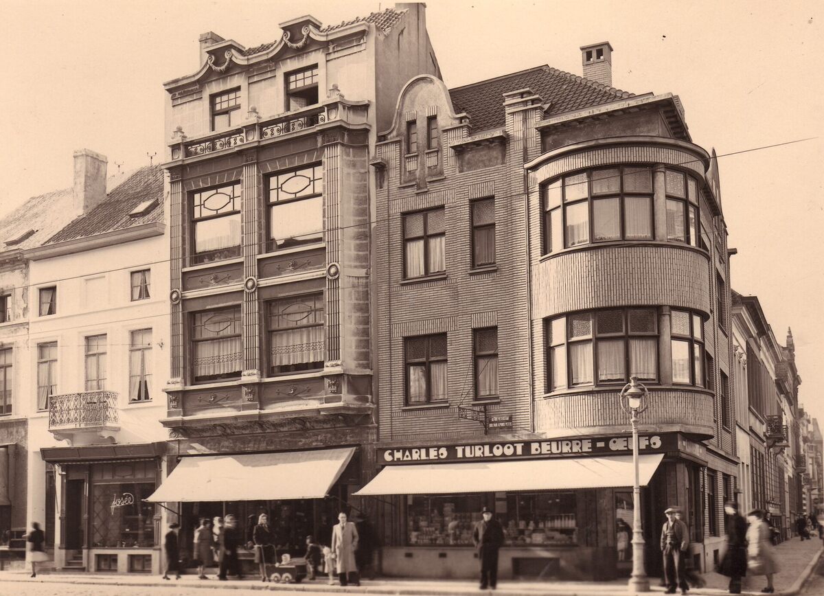 Formaat : 13 x 18 cm. - Zuivelwinkel Charles Turloot op de hoek van de Alfons Pieterslaan 29 en de Léon Spilliaertstraat. Art-decogetint handels- en appartementsgebouw uit het interbellum. In dit pand was later gedurende lange tijd de optiekwinkel Halewyck gevestigd. Het gebouw werd in 2011 gerestaureerd en is sedert 2014 Brasserie Léon Spilliaert.