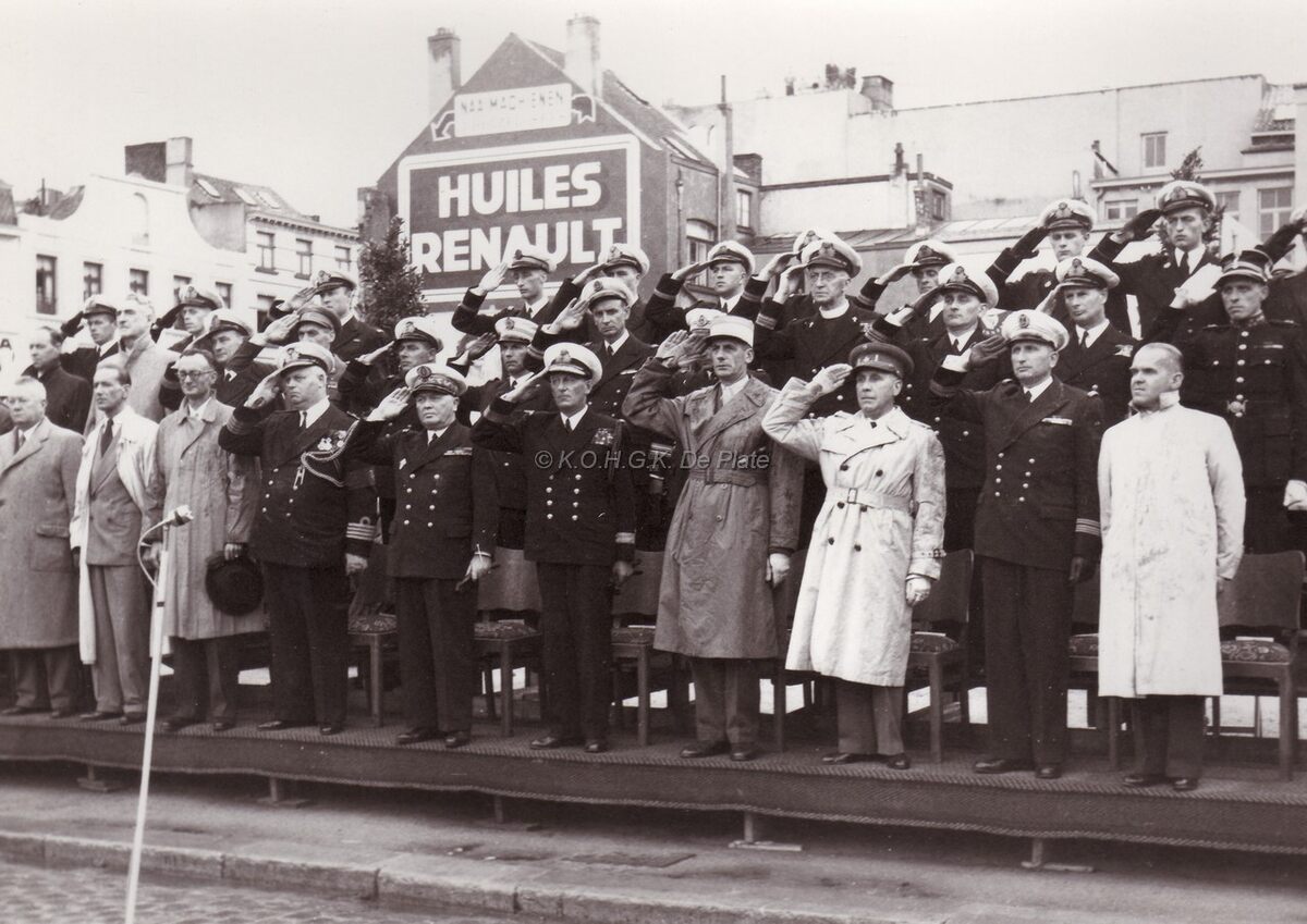 Vaderlandse plechtigheid aan het Wapenplein, de eretribune tijdens het spelen van het vaderlands lied.Militairen van verschillende naties,op de eerst rij, uiterst rechts burgemeester Adolf vAN GLABBEKE, vijfde van rechts commodore TIMMERMANS, zevende commodore ROBYNS en uiterst links schepen Emiel VROOME.