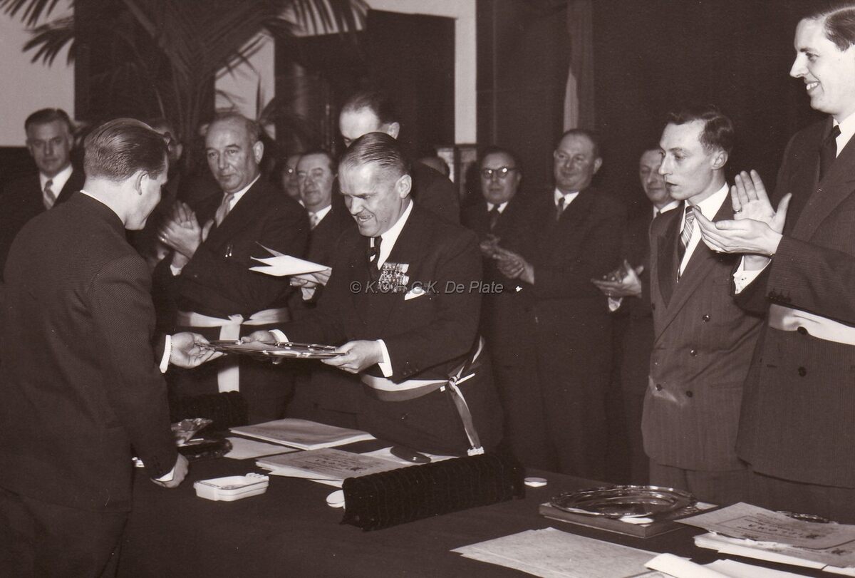 Prijuitreiking door burgemeester Adolf VAN GLABBEKE,links naast hem schepen Kamiel DEHOUCK en uiterst rechts Jan PIERS,latere burgemeester .