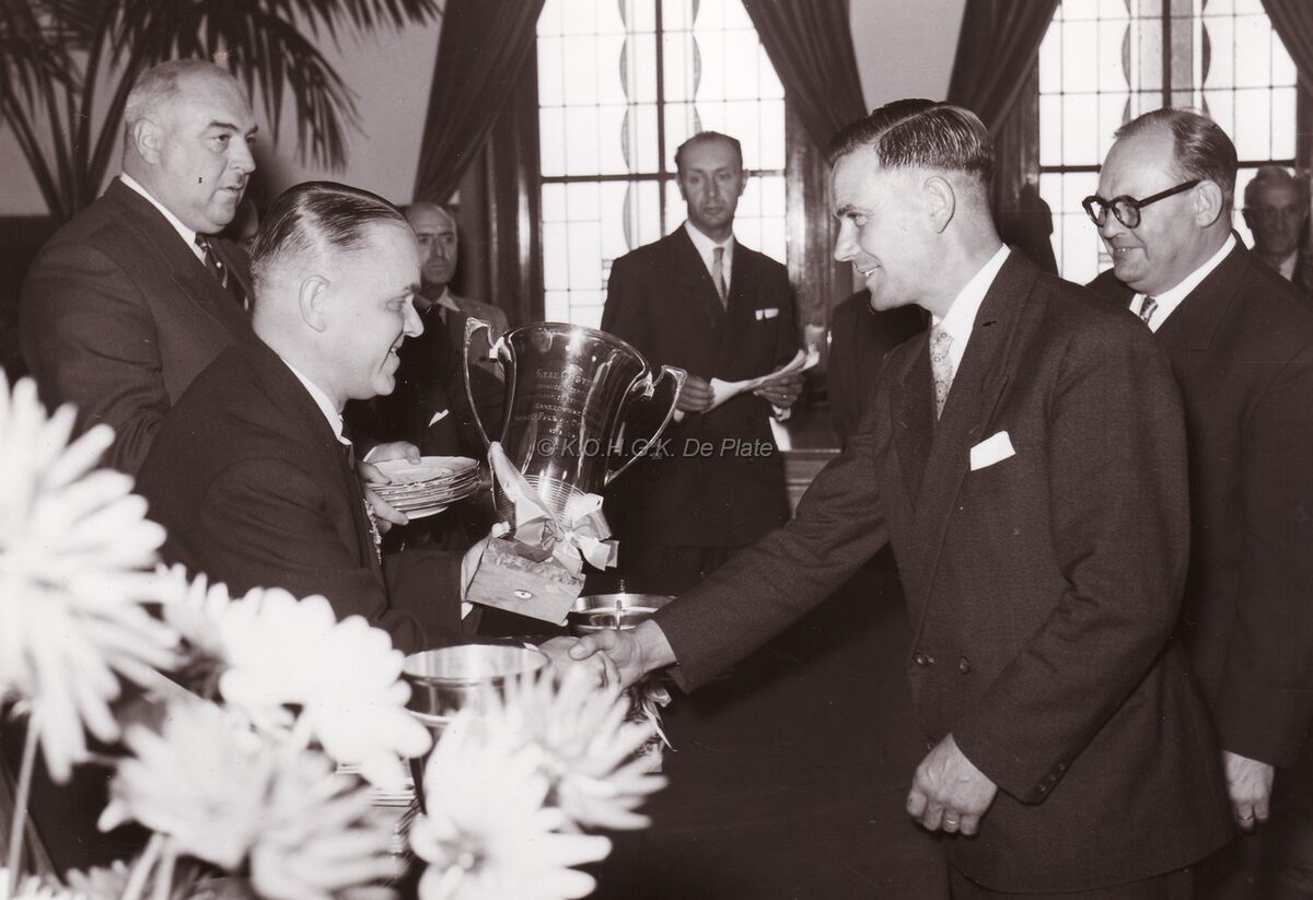 Burgemeester Adolf VAN GLABBEKE overhandigt een stadsbeker in het dd. stadhuis (huidig Gerechtshof).Naast hem staat Maurice QUAGHEBEUR schepen.