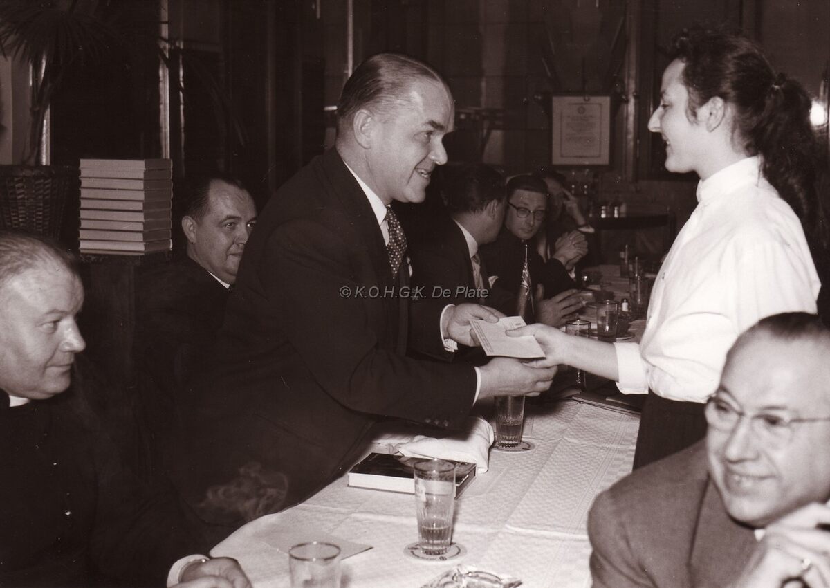 Burgemeester Adolf VAN GLABBEKE bij een prijsuitreiking (Rotary ?) aan een leerlinge van het Koninklijk Atheneum,links zittend de principaal van het O.L.V. College.