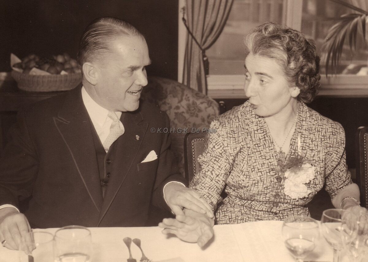 Burgemeester Adolf VAN GLABBEKE koutend met zijn tafeldame op een banket.