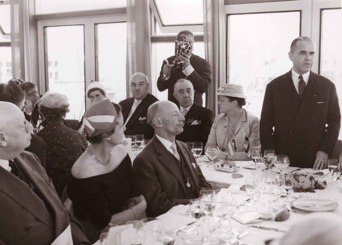 Burgemeester Adolf VAN GLABBEKE houdt een tafelrede op een banket. Links vooraan Michel SURMONT,stadssecretaris, derde van links vooraan Marie Jozef PORTA, gemeenteraadslid, achter de tafel derde van rechts Maurice QUAGHEBEUR,schepen.