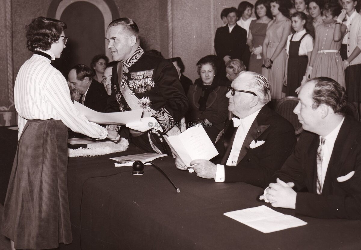 Prijsdeling,burgemeester Adolf VAN GLABBEKE feliciteert juffrouw DECUMAN. Uiterst rechts John HERMANS,journalist en gemeenteraadslid.