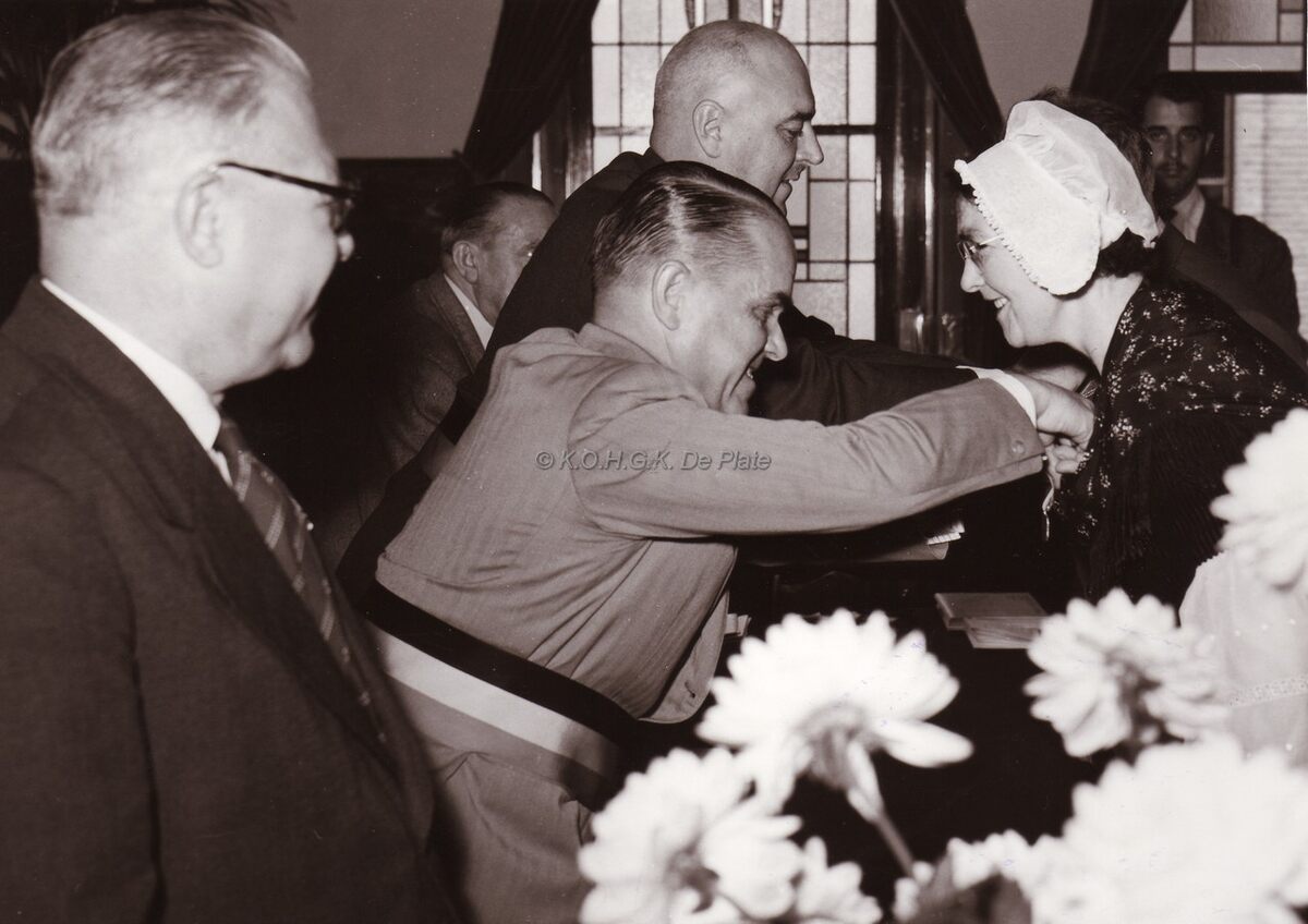 Burgemeester Adolf VAN GLABBEKE en schepen Maurice QUAGHEBEUR vereremerken leden van een folkloregroep tijdens een ontvangst op het dd. stadhuis (huidig Gerechtsgebouw).