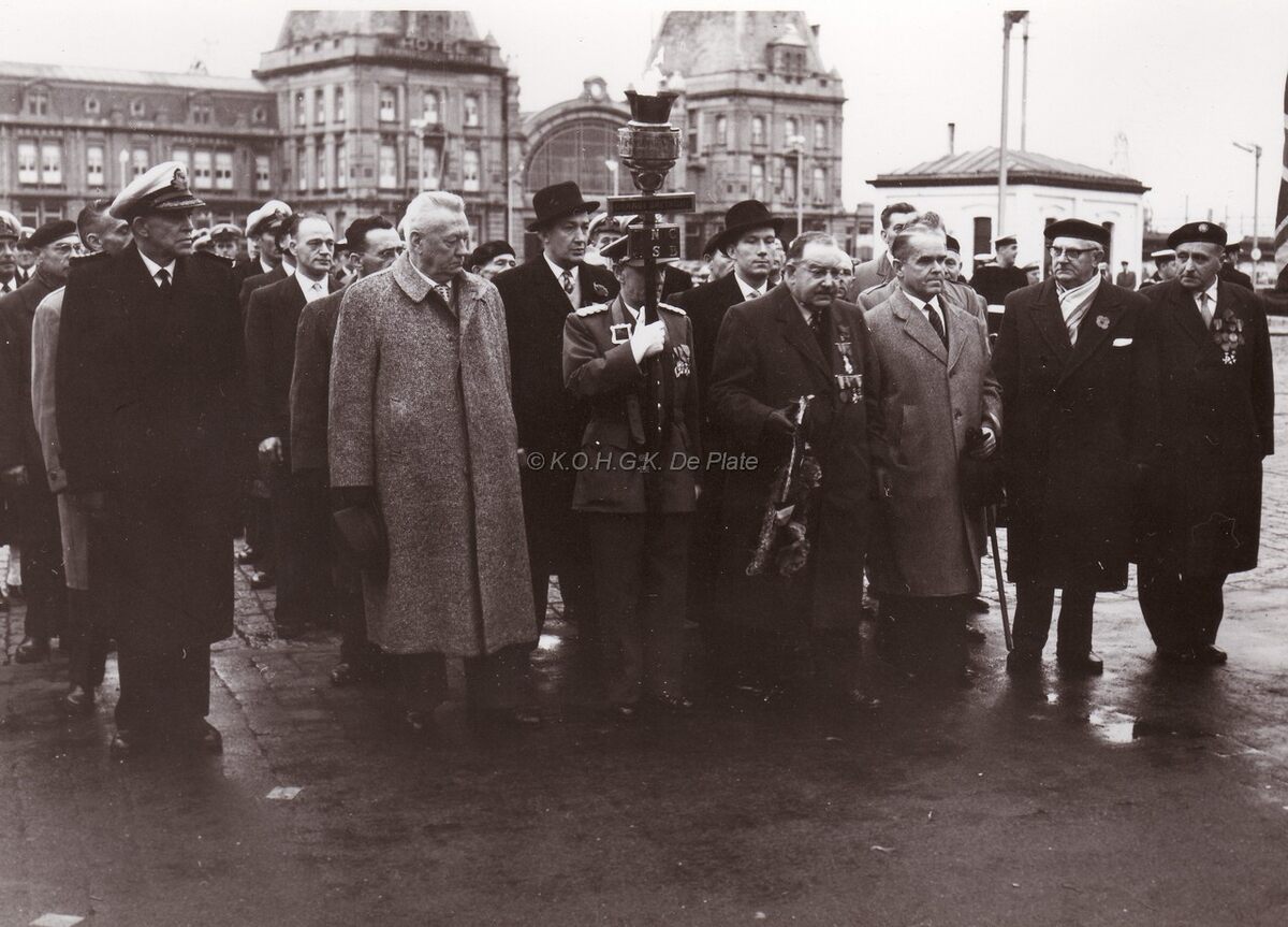 Burgemeester Adolf Van Glabbeke, derde van rechts, en schepen Emiel Vroome, tweede van links, bij de plechtigheid "Fakkel der Zee" aan het monument der gesneuvelden op het Sint Petrus en Paulusplein. Op de achtergrond het Zeestation? Het alleenstaand wit gebouwtje rechts, was ook een openbaar urinoir, gekend om zijn geurverspreiding