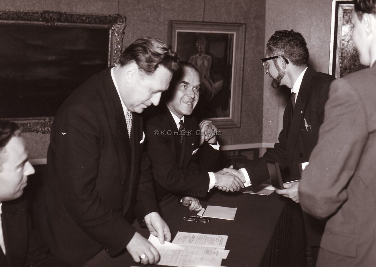 Burgemeester Adolf VAN GLABBEKE overhandigt de stadsmedaille aan een onbekend kunstenaar in het Museum voor Schone Kunsten, toen nog in het voormalige "Chez Pan" in de Koninklijke Schouwburg