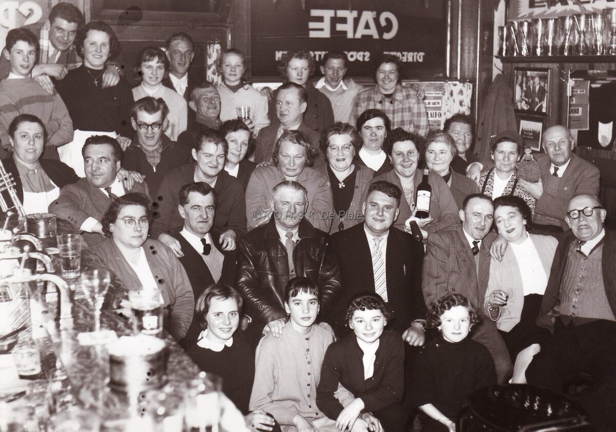 Feestleider Norbert Van der Cruyssen, zittend midden feestvierders in café "Sportclub" te Mariakerke