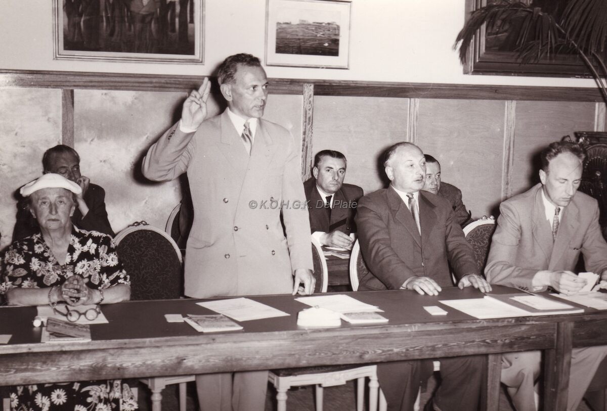 Een nieuw (liberaal ?) gemeenteraadslid wordt ingezworen.Vooraan links Berthe TRATSAERT enig vrouwelijk gemeenteraadslid. Uiterst rechts Willy SIX en Theo DEHAENE