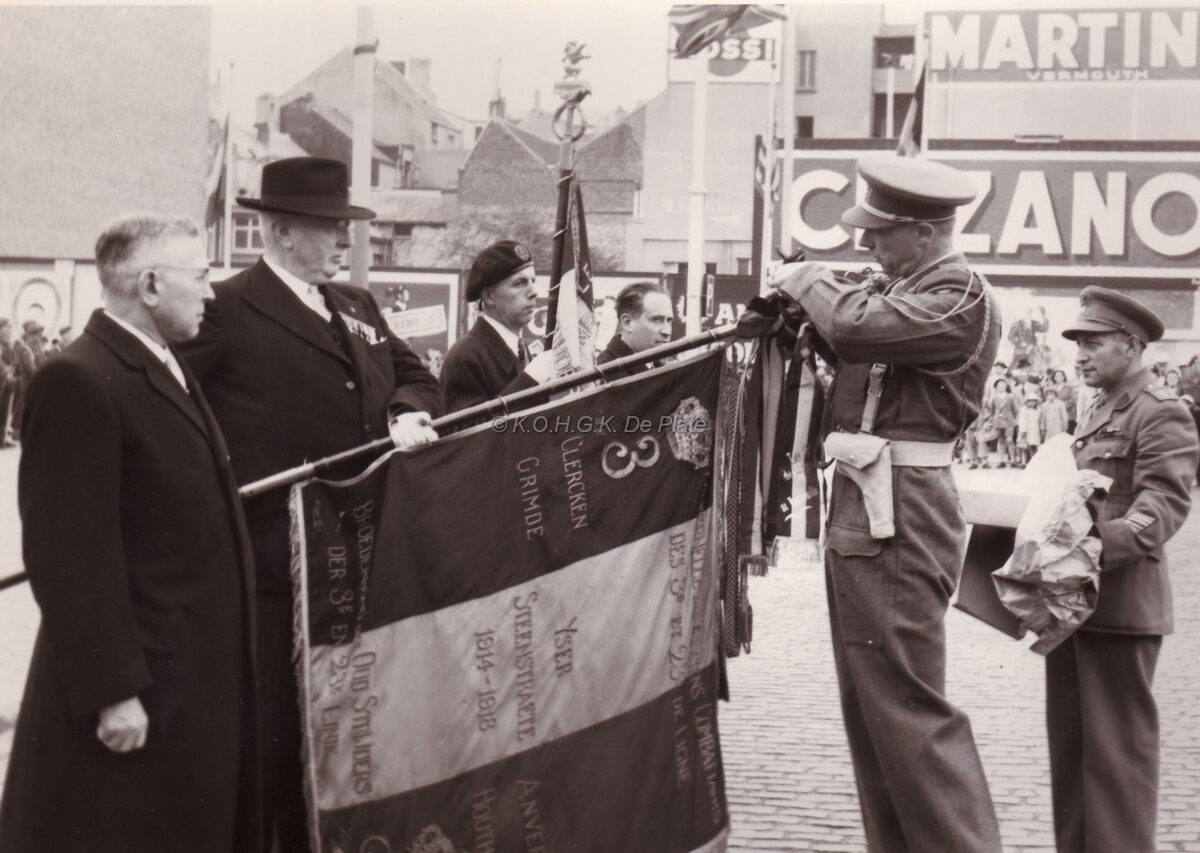 Een erelint wordt bevestigd aan het vaandel van het 3e en 23e linieregiment tijdens een vaderlandse plechtigheid op de grote markt.