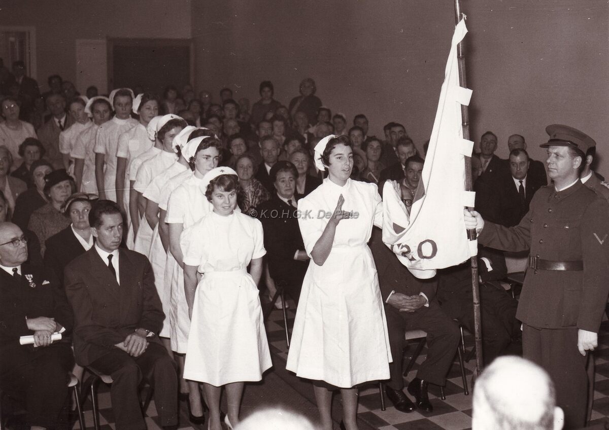 Ambulancierster bij hun eedaflegging op het vaandel van het Rode Kruis.