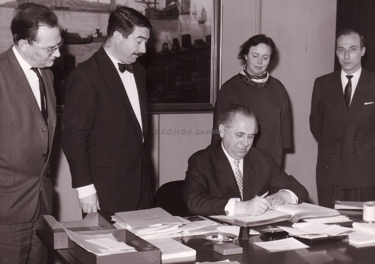 Een gast tekent het gulden boek (?) van de stad. Links staat Frank EDEBAU, stadsconservator, naast hem schepen Roger DE KINDER, staand rechts, Fred RIGAUX, hoofd dienst toerisme.