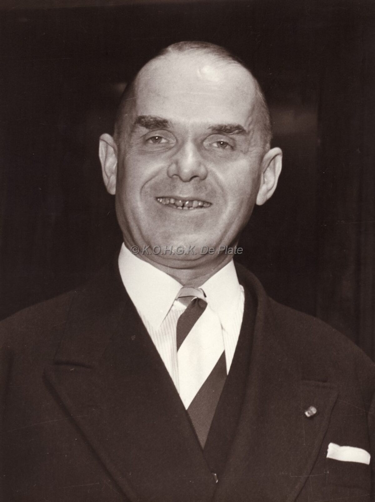 Portret van burgemeester Adolf VAN GLABBEKE. Geboren : Oostende 8 augustus 1904 en overleden in Zanzibar 5 juli 1959. Lid van de Liberale partij. Burgemeester van Oostende van 1953 tot 31.01.1959. Provincieraarslid van West-Vlaanderen. Volksvertegenwoordiger (1936-1959). Minister van Binnenlandse Zaken (1945-1946), Justitie (1946), Openbare Gezondheid (1949-1950), Openbare Werken en Wederopbouw (1954-1955). Voorzitter ACLVB (1944-1959). Hij woonde in de Antwerpenstraat 17 en Albert I-Promenade 67b
