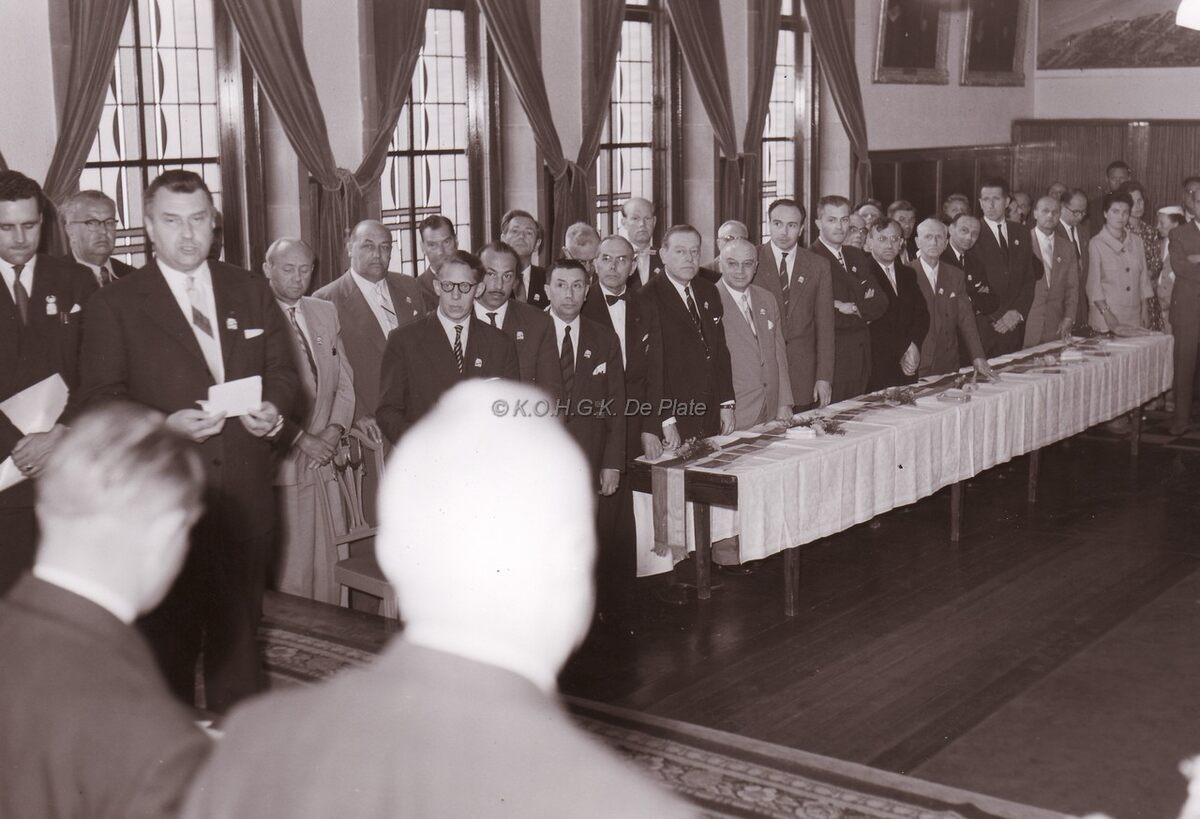 Plechtige ontvangst van een vereniging op het Gerechtshof, toen dienstdoend stadhuis