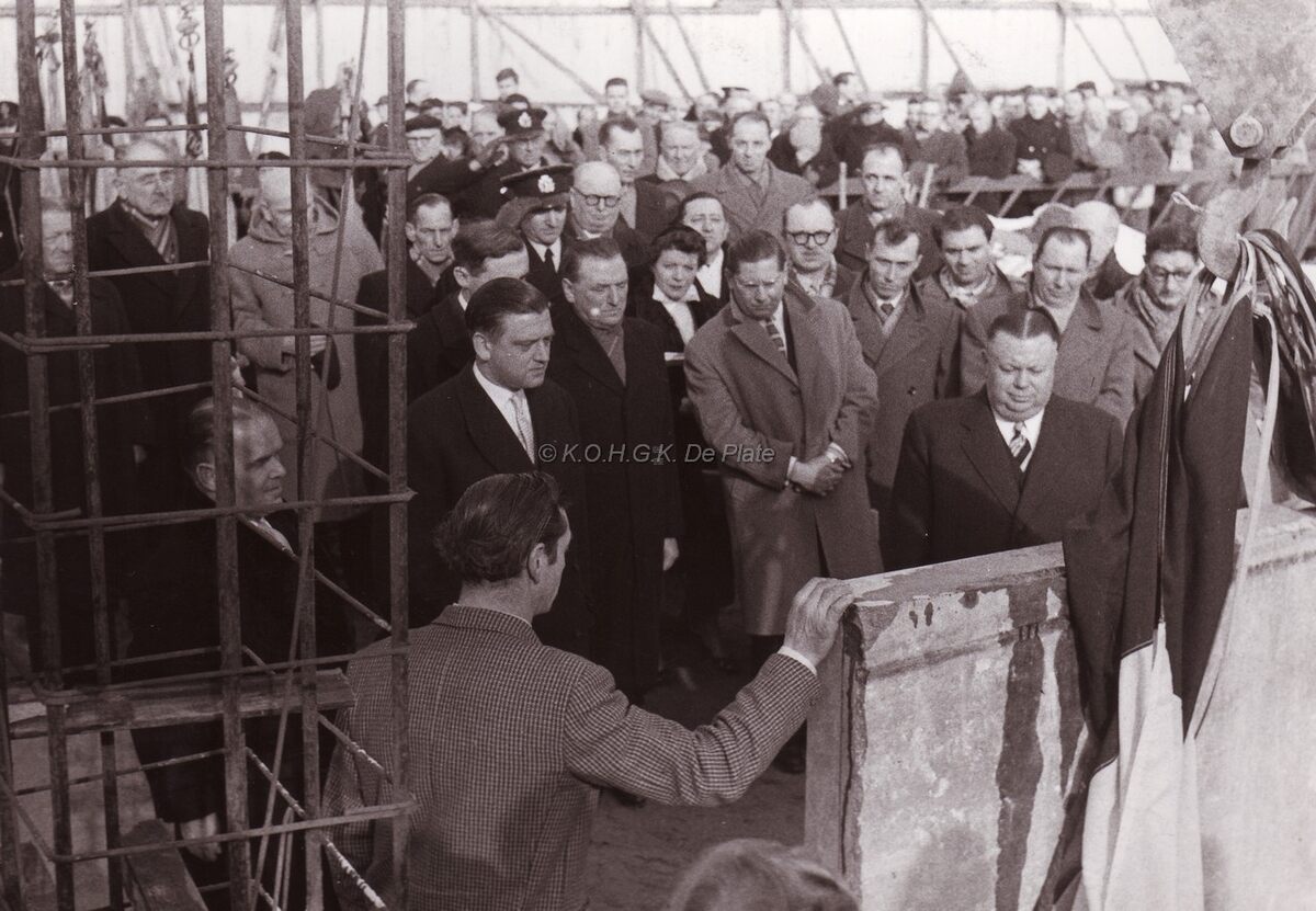 Een eerste steen wordt gelegd (onbekende locatie). Achter de betonbewapening links staat burgemeester Adolf VAN GLABBEKE met naast hem minister Omer VAN AUDENHOVE van Openbare Werken.