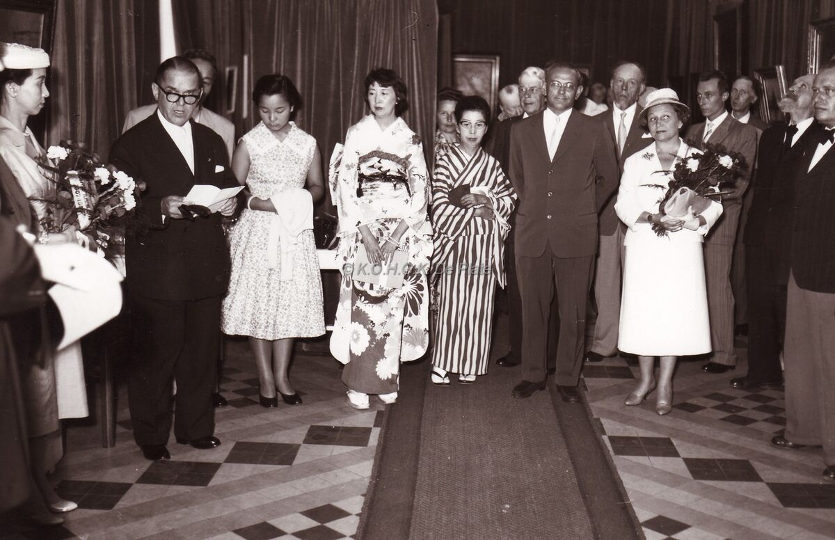 Burgemeester Adolf VAN GLABBEKE opent een tentoonstelling in de Koninklijke Gaanderijen, zijn echtgenote (in het wit en met bloemen) was er ook bij evenals een Japanse afvaardiging. Achter mevrouw VAN GLABBEKE, een jonge Fred RIGAUX, hoofd toerismedienst.