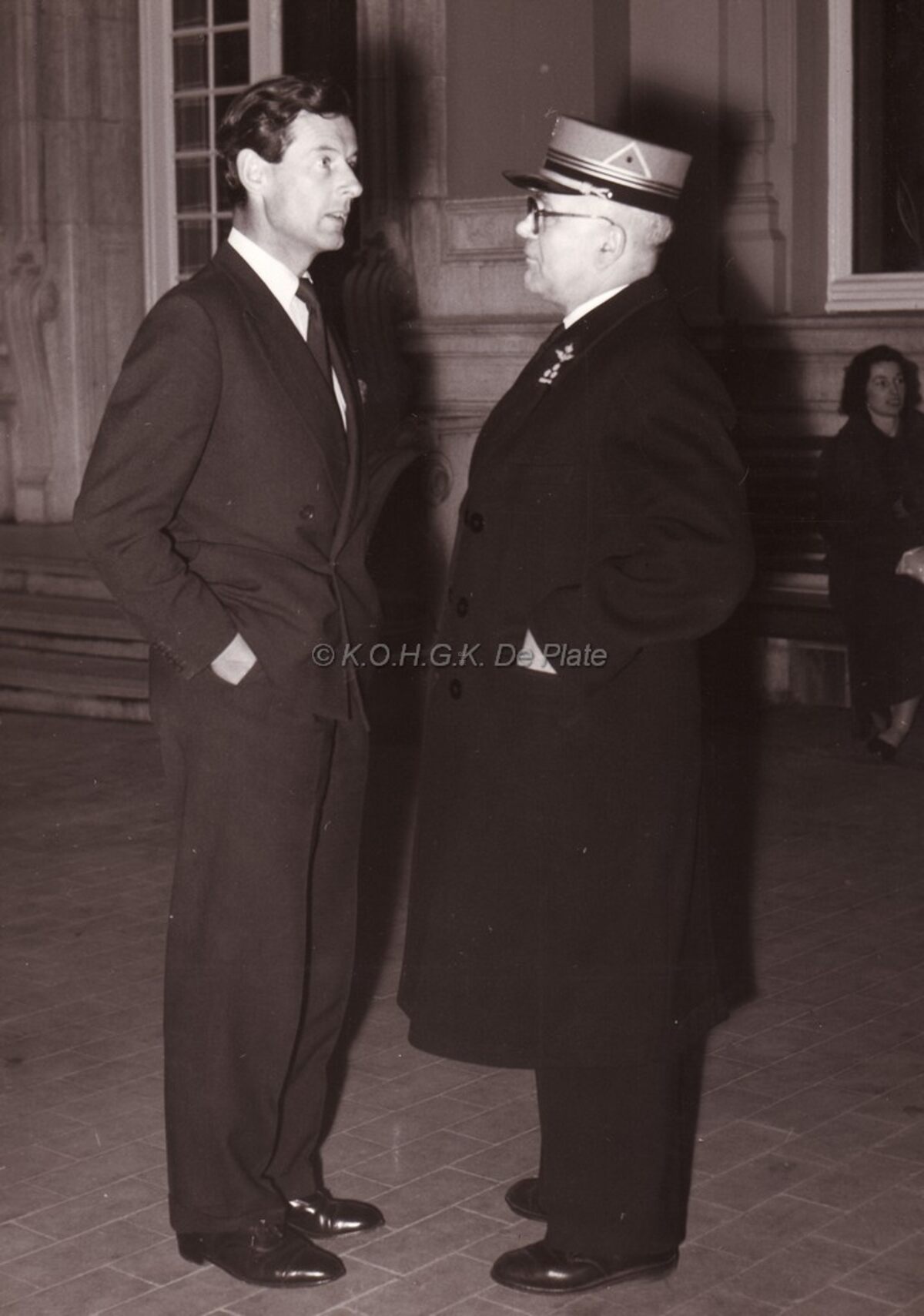 Peter TOWNSEND een gewezen gevechtspiloot uit W.O. II tijdens een doortocht te Oostende in gesprek met de oostendse stationschef.Hij had destijds een relatie met prinses Margaret, zuster van de britse koningin.