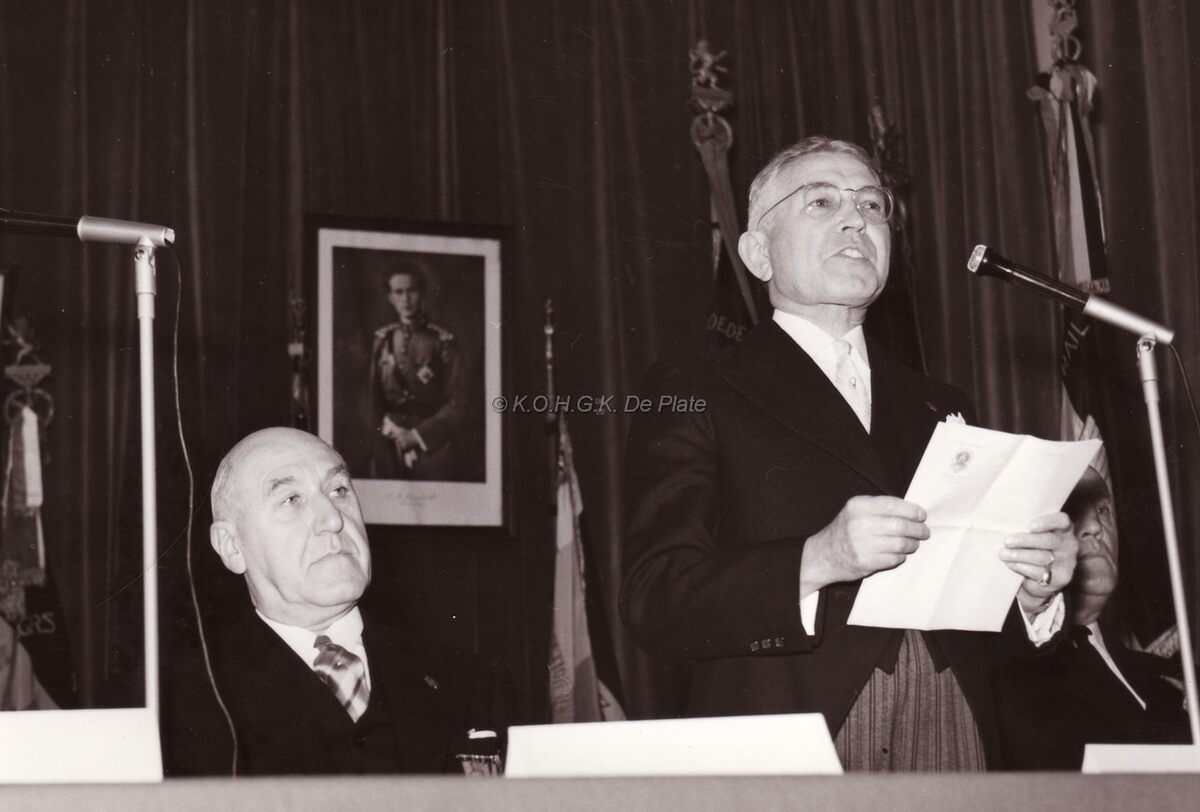 Firmin Decoster, federaal voorzitter van de "Broederbond der Oudstrijders der 3de en 23ste Linieregimenten" houdt zijn toespraak naar aanleiding van de viering van het 25 jarig bestaan van het "Verbond der Oudstrijdersmaatschappijen van Oostende (VOSMO). Naast hem, Robert Elleboudt, voorzitter van VOSMO