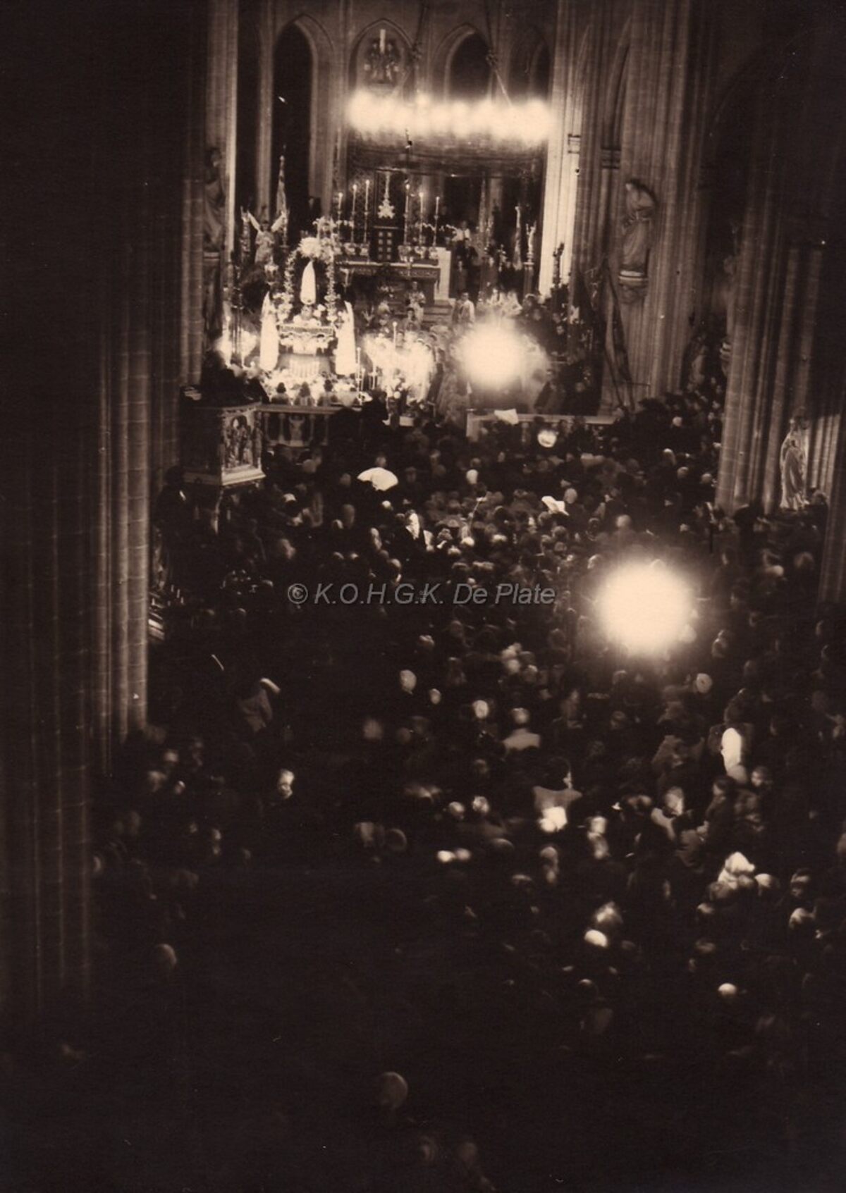 Algemeen zicht op de deelnemers aan de Processie van O.L.V. van Fatima in de Sint Petrus en Pauluskerk.Foto van op het oksaal.