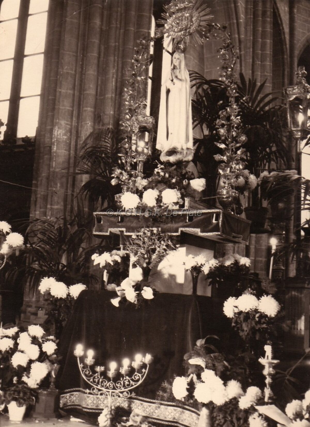 Het Mariabeeld uit de processie van O.L.V. van Fatima in de Kerk (Sint Petrus en Paulus).