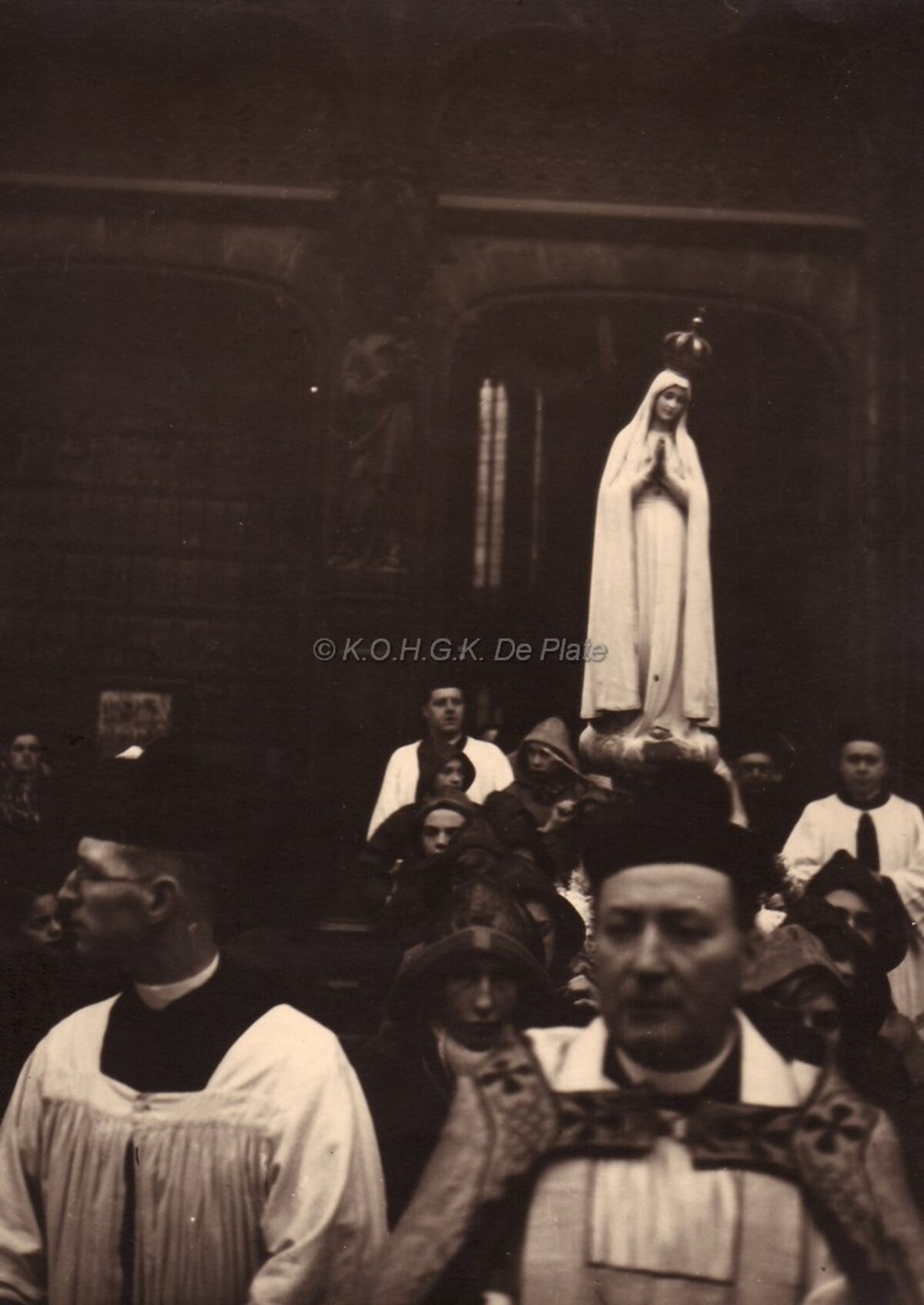 Het Mariabeeld,voorafgegaan door priesters,bij het verlaten van de Sint Petrus en Paulus kerk tijdens de processie van O.L.V. van Fatima.