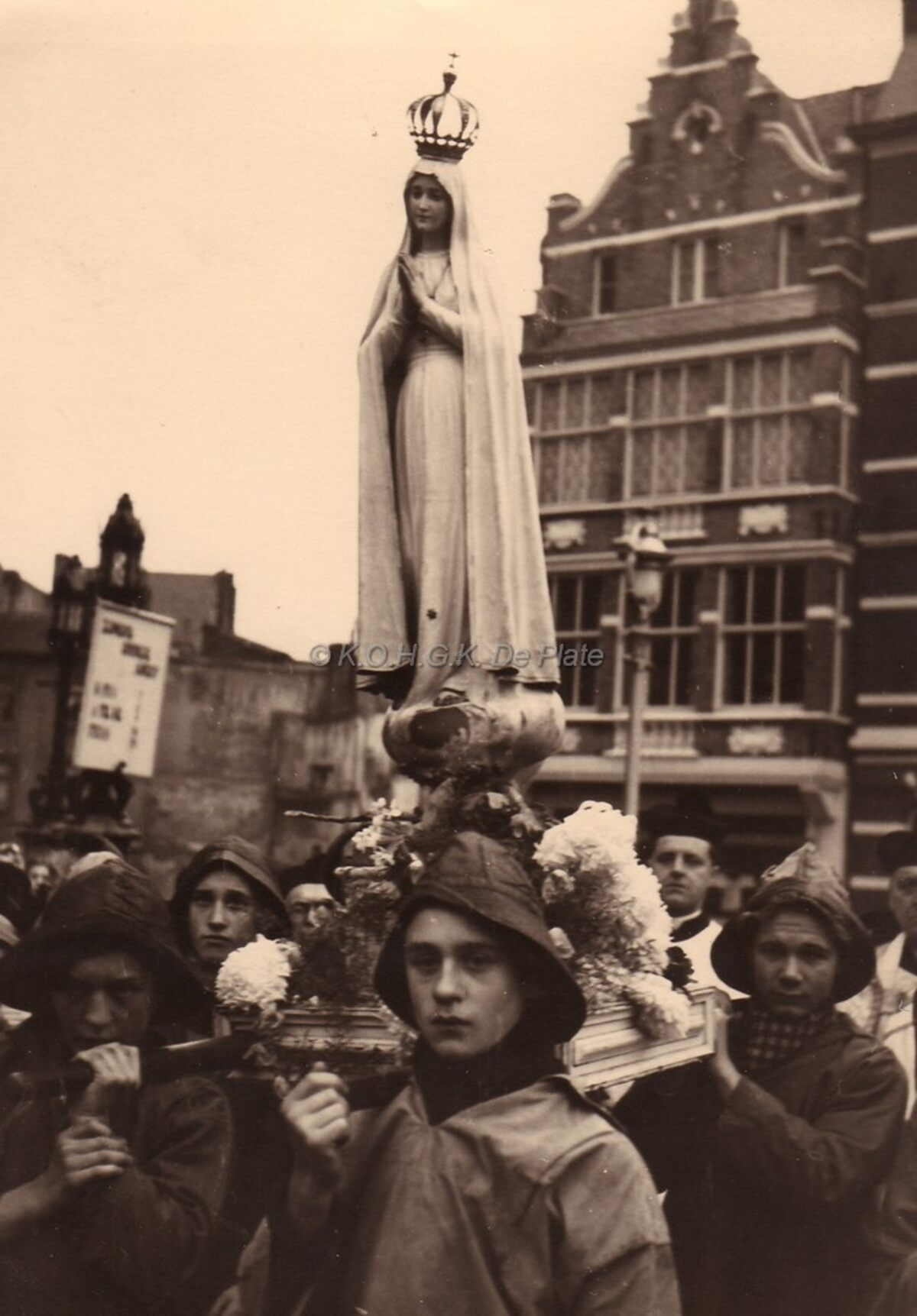 Het Mariabeeld, gedragen door jongeren, voor de Sint Petrus en Pauluskerk tijdens de processie O.L. V. van Fatima.
