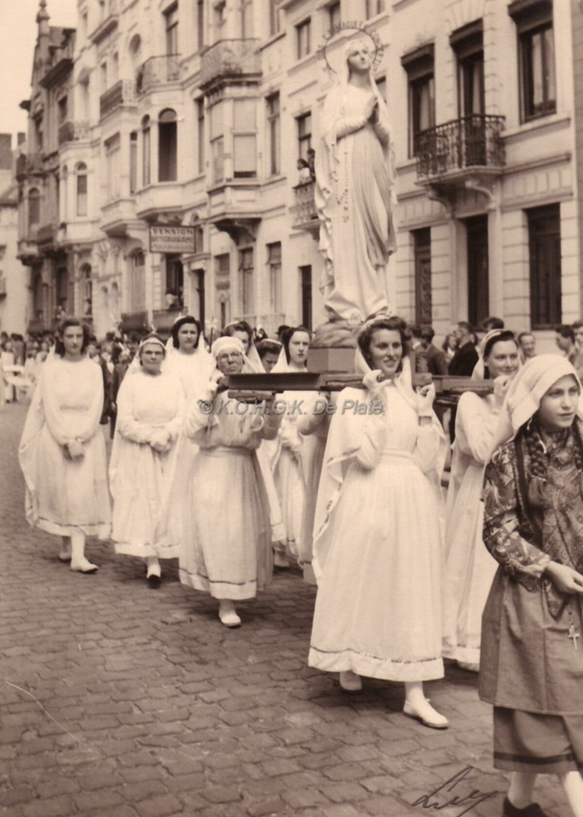 Processie op de Sint Jozefsparochie,maagdekens met het Mariabeeld in de Rogierlaan.