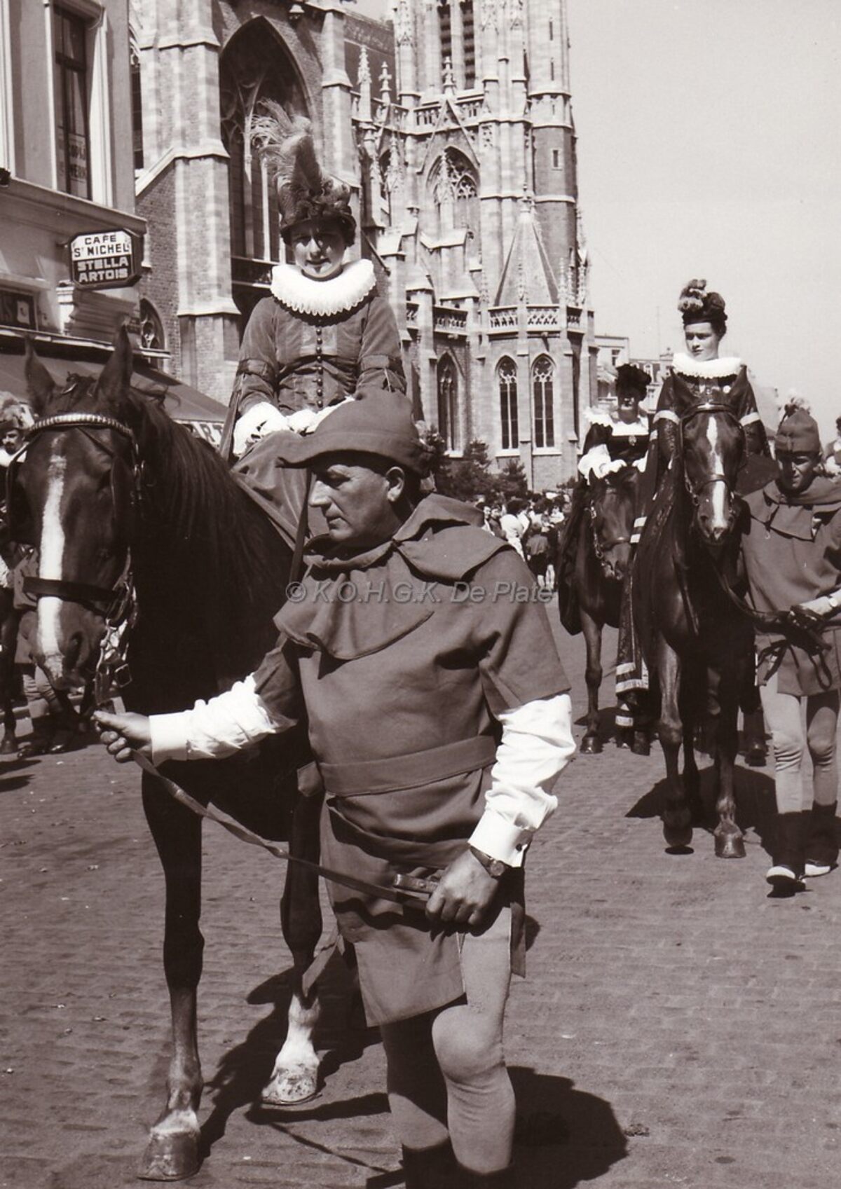 De adel paradeert in de optocht van de Zeewijding.Links het gekend café Sint Michel op de hoek van de Jozef II-straat en de Sint Pietersstraat.