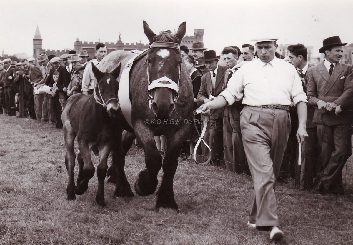 Een brabantse merrie en haar veulen worden voorgeleid tijdens een paardenprijskamp op de Wellingtorenbaan.Op de achtergrond het gebouw van de Duivenschieting.