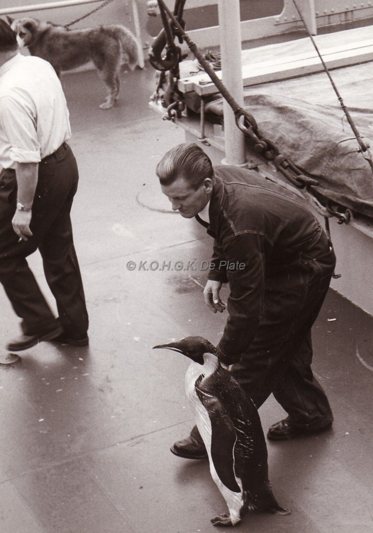 Een pinguin aan boord van de Polarhav,het schip van de Belgische poolexpeditie van 1958.