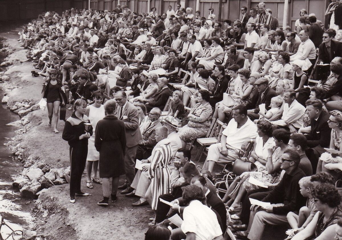 De toeschouwers tijdens een zwemfeest van Ostend Swimming Club in het zwembad bij het Koninginnehof in het Maria Hendrikapark.