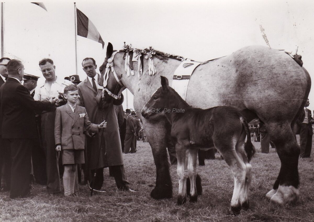 De brabantse merrie Sarah D.H. Rinde en haar veulen krijgen een prijs op een paardenprijskamp op de Wellingtonrenbaan van burgemeester Adolf VANGLABBEKE.