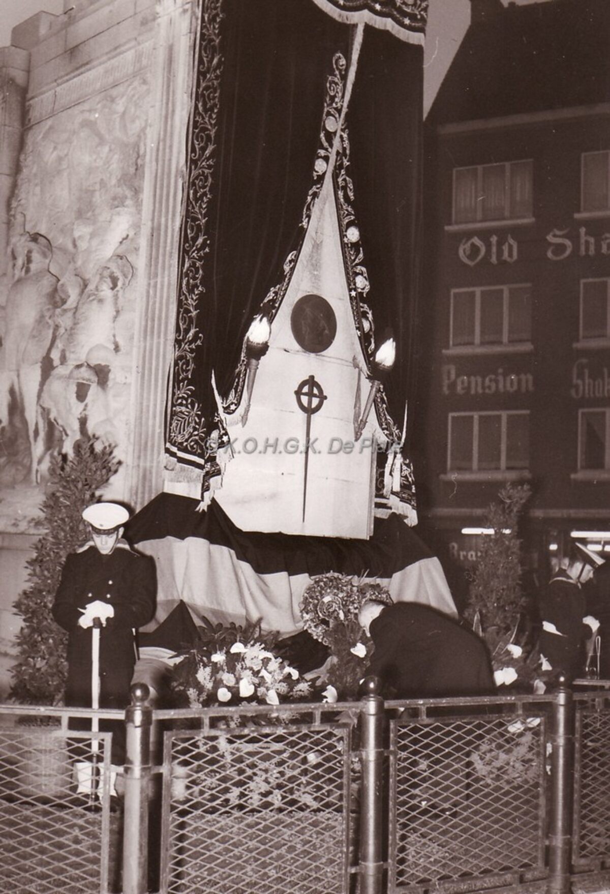 Het monument der gesneuvelden, met rouwdoeken behangen ,op het Sint Petrus en Paulusplein. Het rouwbehang is van de firma Cyriel VANDERGUNST.