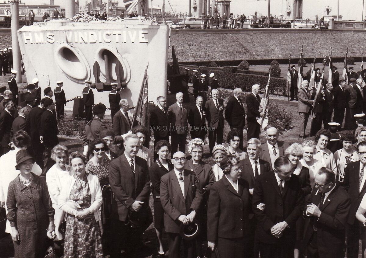 Britse en Belgische oudstrijders bij een herdenkingsplechtigheid aan het Vindictive gedenkteken aan de Slijkensesteenweg. Jongens van het Koninklijk Werk Ibis nemen ook deel aan de plechtigheid