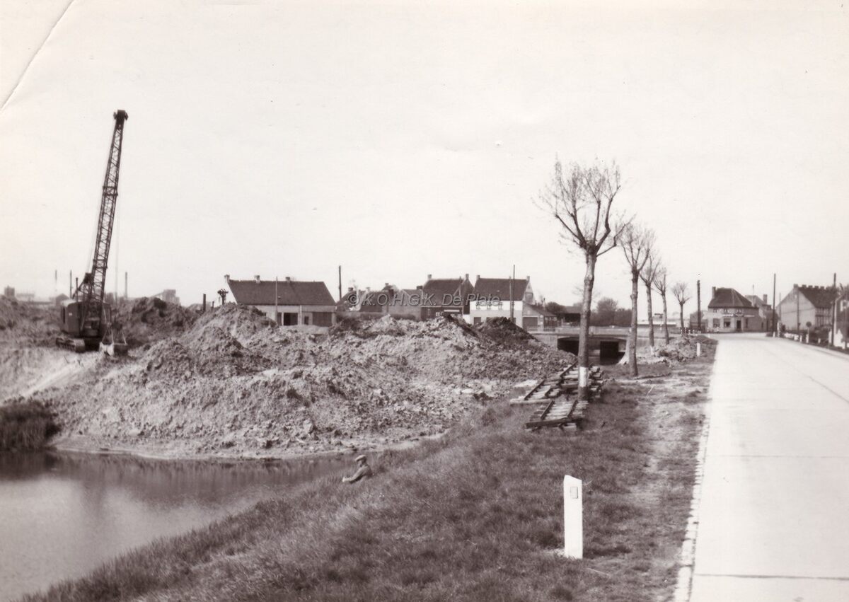 Wegenwerken te Bredene (?).Een inboorling zit te zonnen aan het water.