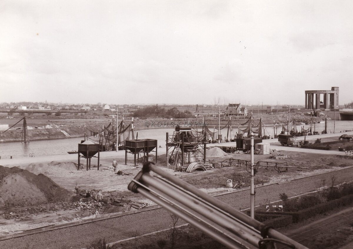 Vissersboten aan de kaai gemeerd te Nieuwpoort.Op de achtergrond rechts het monument Albert I.