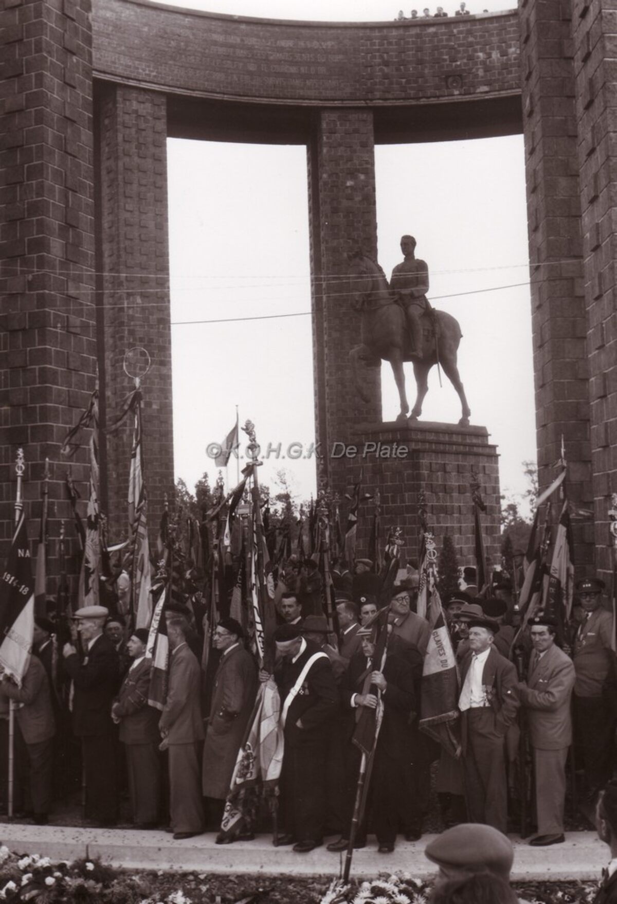 Oudstrijders mét vaandel tijdens een huldiging aan het monument Albert I te Nieuwpoort.