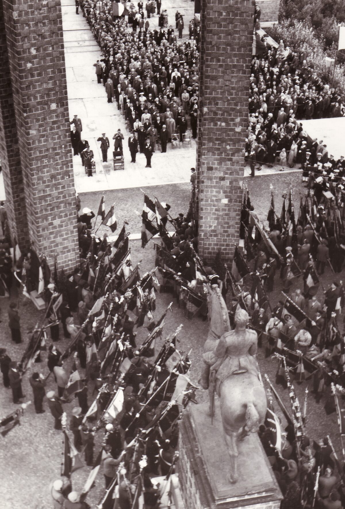 Zicht van bovenaf op een huldiging aan het monument Albert Ite Nieuwpoort.