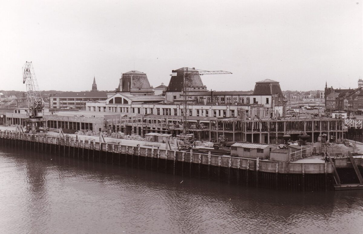 Formaat : 13 x 18 cm. - Het kantoorgebouw van het Zeewezen aan de Natiënkaai in opbouw. Vooraan rechts de aanlegplaats voor de overzetboot van het Zeewezenpersoneel. Gebouwd als Zeewezengebouw en inschepingshal voor de pakketboten naar Dover, later hoofdgebouw van de RMT en vervolgens van Oostende Lines. Gebouwd in de periode 1956-1958 naar ontwerp van de Gentse architecten V. Vaerewyck en J. Hebbelynck, door de bouwfirma Gebroeders Deveeuw (Wevelgem).