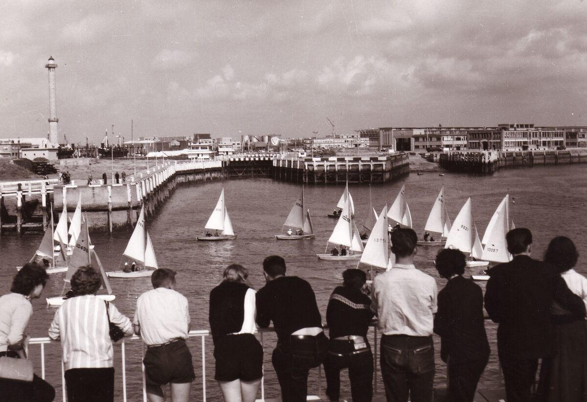 Formaat : 13 x 18 cm. - Toeschouwers bij een zeilwedstrijd met start in de havengeul kijken toe vanop het terras van het clubgebouw van de R.N.S.Y.C.