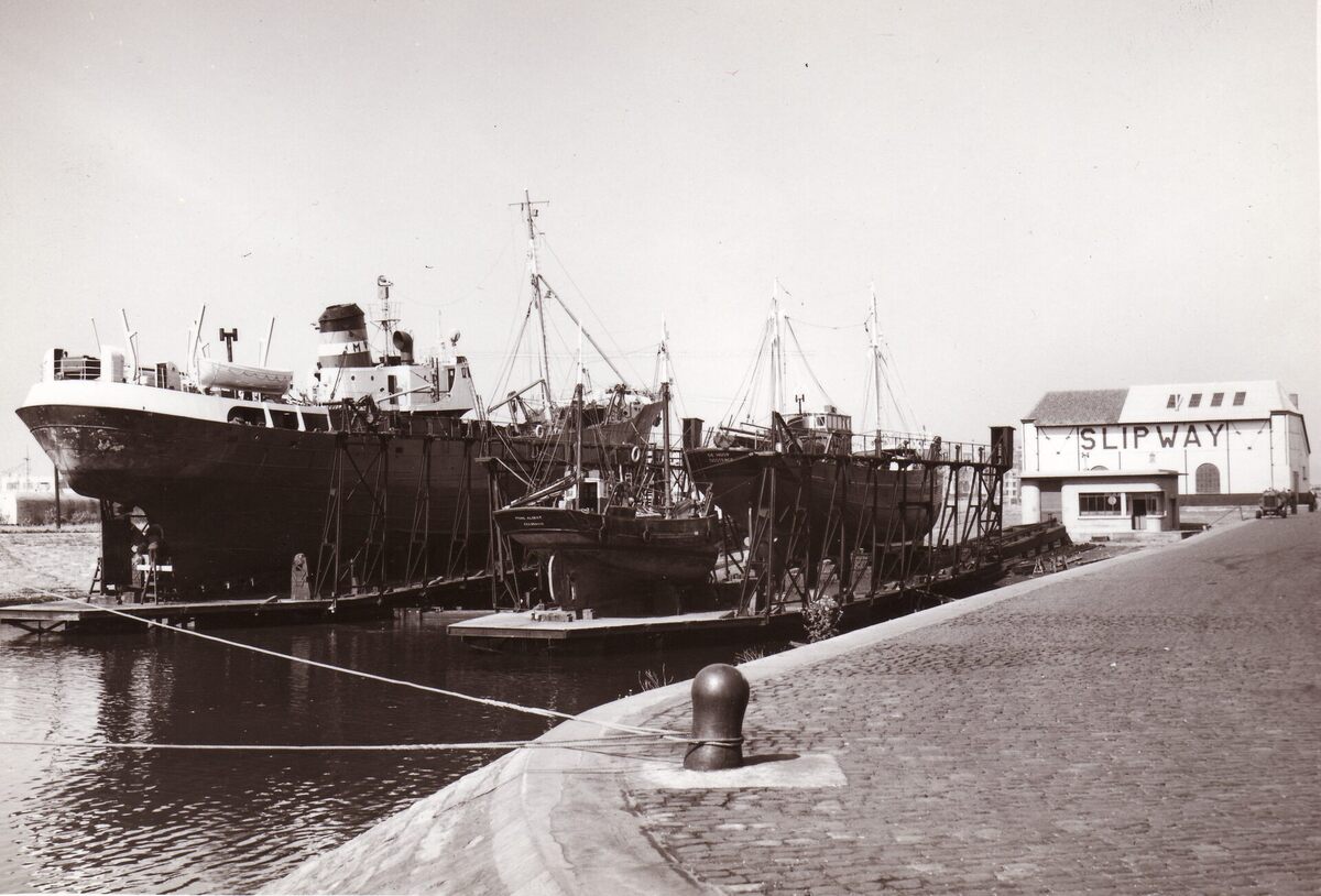 Formaat : 13 x 18 cm. - Een groot vissersvaartuig van de rederij M.V. en twee kleinere op de Slipway aan de Buskruitstraat. Zicht van op de Slipwaykaai. De twee slipways zijn geïnstalleerd op een bedding van 132,70 m. en een helling van 0,081 m. per meter. De grootste heeft een draagvermogen van 1000 ton, een lengte van 50 m. en een nuttige breedte van 11,50 m. De andere heeft een draagvermogen van 500 ton, een lengte van 40 m. en een nuttige breedte van 9,50 m. (Het havencomplex van Oostende, p.69-70) Plate bib B961.