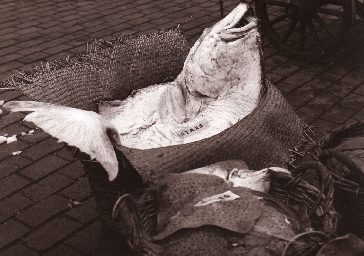 Formaat : 13 x 18 cm. - Een reuze heilbot gekocht door handelaar Staes. Op de voorgrond een ben met roggen.