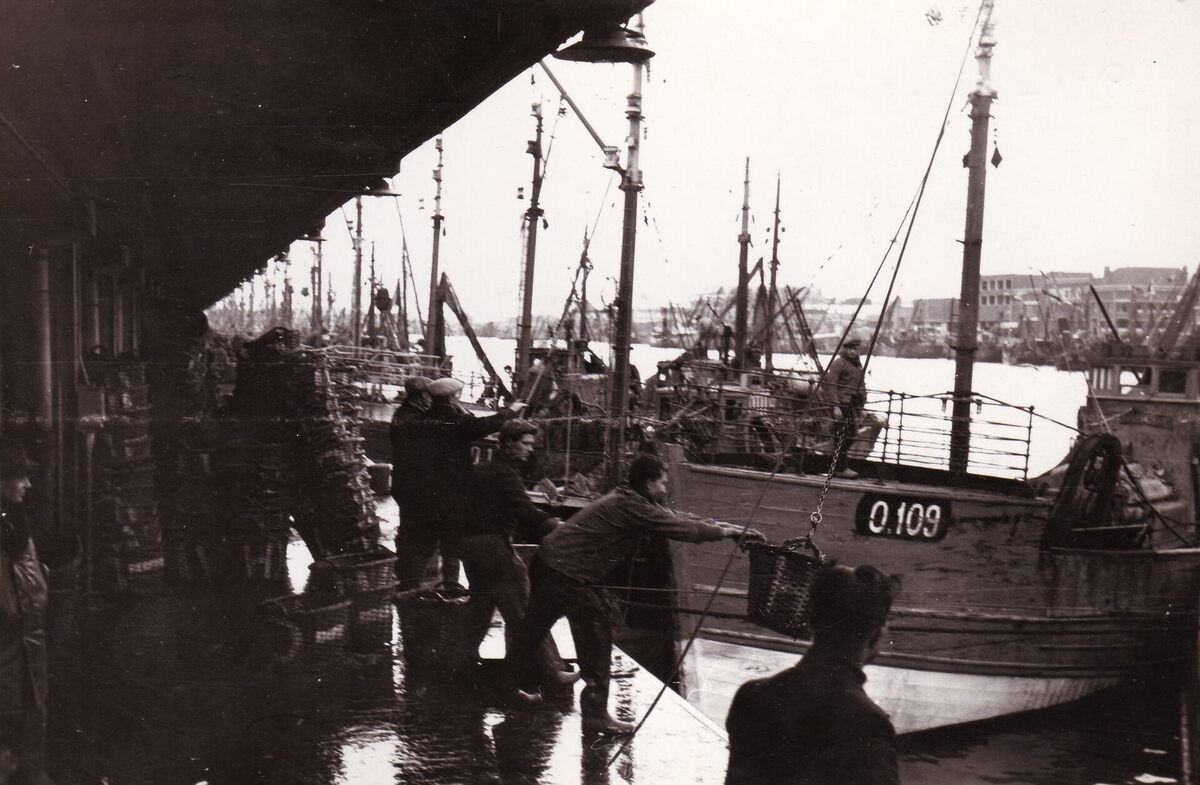Formaat : 13 x 18 cm. - Vislossers in actie bij het lossen van de vangsten in de Vismijn.Talrijke boten liggen aangemeerd.