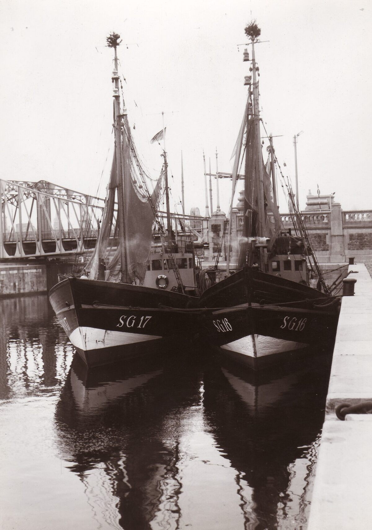 Formaat : 18 x 13 cm. - Twee Duitse treilers aangemeerd in het Vlotdok nabij de Demeybrug.