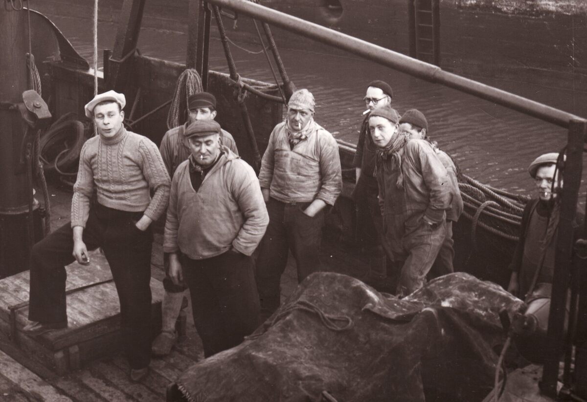 Formaat : 13 x 18 cm. - De bemanning van een vissersvaartuig bij het vertrek in de sluis van het Visserijdok.