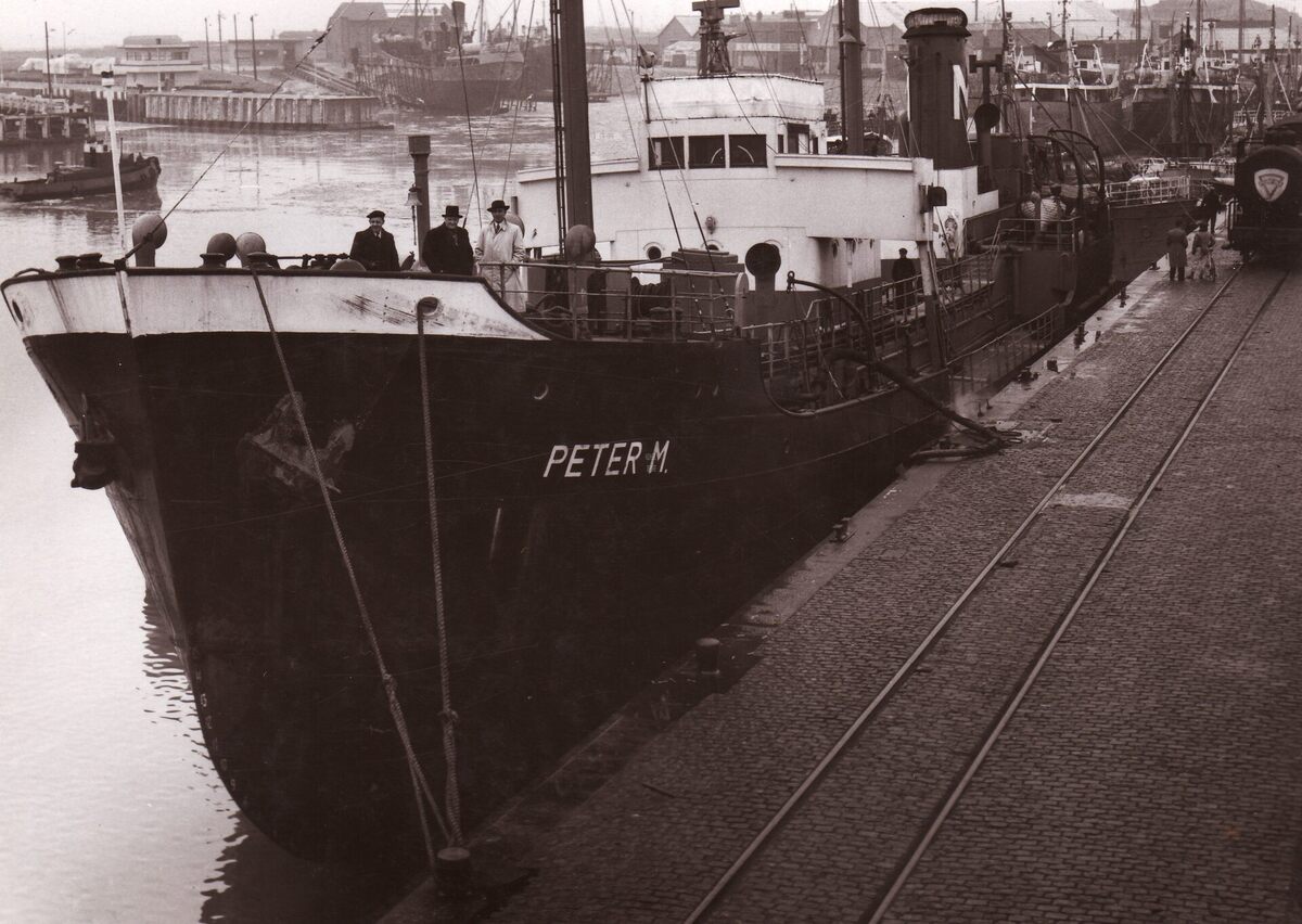 Vormaat : 13 x 18 cm. - De Peter M met vooraan de eigenaars, ligt aan de Hendrik Baelskaai in het Visserijdok. Het schip wordt met brandstof bevoorraad. Op de kaai een tankwagen van Purfina.