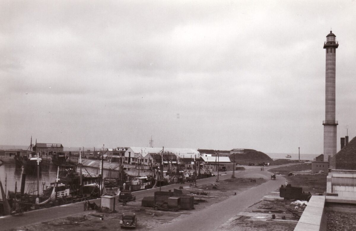Formaat : 13 x 18 cm. - Zicht van op het dak van een gebouw aan de Hendrik Baelskaai op het Visserijdok met links de Slipwaykaai, in het middden de scheepswerf Seghers en rechts de vuurtoren (Lange Nelle).
